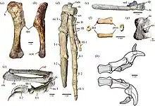The holotype is a nearly complete juvenile skeleton intertwined with three other individuals. Notably, three skulls and a good amount of arm material are known. The known manus has only two functional fingers, with the third being significantly reduced. Such a morphology is also seen in a wide variety of theropods such as a few carcharodontosaurian allosauroids,[2] however it can also be seen in other coelurosaurs such as the tyrannosaurids, the avialan Balaur bondoc, and caudipterid oviraptorosaurs.[1]