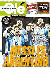 ![]() Argentina qualified for the 2018 World Cup, as covered by Olé, 10 October 2017 | |