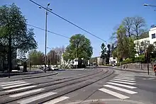 The Skøyen Line of the Oslo Tramway follows Drammensveien, which intersects with Bygdøy allé at Olav Kyrres plass