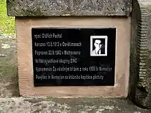 ![]() A memorial granite plaque in village Osvětimany dedicated to the memory of Czechoslovak officer (lieutenant) Oldrich Pechal (1913-1942) - commander of the ZINC airborne operation. The plaque was ceremonially unveiled (as part of repairs in 2013 at a total cost of 120 thousand crowns) on the front side of the existing monument to the Victims of World War I and II in the park in May 2013 in his native village. | |