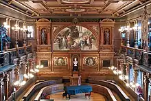 Along both side walls and the entrance wall of the hall are listed thirty-seven names of famous Heidelberg scholars, divided into two rows - one on the upper frieze and one on plaques in the railings of the gallery. They range from Marsilius of Inghen, the founding rector of the University in 1386, to 19th century professors like the chemist Robert Bunsen and the physicist and physician Hermann von Helmholtz. On the right balcony is the jubilee banner, which was made for the 500th anniversary of the University's founding. In the centre of the banner is an allegorical personification of wisdom. On the back is a text saying "Donated by women and daughters of the academic teachers, 1886."