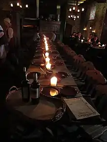 The restaurant Olde Hansa with 300 customer places was opened in the building in 1997, becoming one of the most famous tourist destinations in Tallinn. The style of the restaurant, including the food and drink, the cutlery and the dress of the staff in the three-floor restaurant were modelled after the Hanseatic League. Original recipes of the Hanseatic time were used, without ingredients introduced to Europe in the 15th century or later. For example the recipes do not use any potato or maize. Instead there are many game dishes, including elk, bear and pheasant. The drinks include house beer and pepper schnapps.[1] There is a furnace room on the third floor.