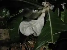 Oldenburgia grandis is a shrub or small, gnarled tree in the family Asteraceae. It occurs in the mountains around Grahamstown in South Africa. It grows to a height of about 5m on sandstone outcrops. It has thick corky bark and large leaves clustered at the ends of branches. The leaves are dark green and leathery, reminiscent of loquat leaves, but generally a good deal larger. The emergent leaves are densely and completely felted with white hair. Most of the felt is lost as the leaf matures, but some persists on under-surfaces. Flowers are white or purplish and borne in large heads some 5- to 12 cm in diameter. The flowerheads are terminal; The same plant may bear solitary heads, plus heads borne in loose, irregular panicles. It is threatened by habitat loss.