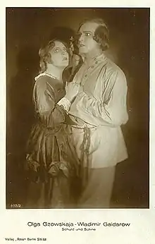Gzovskaya was born to a family of a Moscow customs official[1] of Polish origin. In 1905, she graduated from the Imperial Drama School at the Maly Theatre,[2] having studied under Aleksandr Pavlovich Lensky.[3] On 1 September 1905 she joined the Maly Theatre troupe, with the first role of Ariel in "The Tempest" by William Shakespeare, that October.[1] From 1905 to 1908, she appeared at the Maly Theatre.[3] In 1907, she met Konstantin Stanislavski at a summer resort and began taking private acting lessons from him.[2] During their classes Stanislavski commented to Gzovskaya that she should perform at the Moscow Art Theatre, which she took as an offer of employment and quit the Maly. As the board had not been consulted, the engagement by the Moscow Art Theatre became contentious and she was forced to tour throughout Russia during the 2008-2009 season.[4] Her employment was also complicated because her fiancé Vladimir Nelidov, who was working at the Maly, was trying to become the manager of the Moscow Art Theatre, but the theater did not trust his reputation.[5] In July 1908, she and Nelidov married.[1]