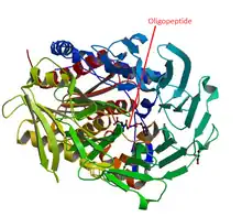 An Oligopeptidase is an enzyme that cleaves peptides but not proteins. This property is due to its structure: the active site of this enzyme is located at the end of a narrow cavity which can only be reached by peptides.