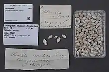 Olivella mutica, common name the variable dwarf olive, is a species of small sea snail, marine gastropod mollusk in the subfamily Olivellinae, in the family Olividae, the olives. Species in the genus Olivella are commonly called dwarf olives.