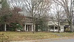 Houses in the district generally feature architectural styles that were popular in the early twentieth century, such as the Colonial Revival, the Tudor Revival, the Arts and Crafts, the American Foursquare, and the Prairie School. Many of the district's Colonial Revival houses were constructed by William F. Nelson, who acted both as architect and as general contractor for these projects. Standing out from all other houses in the district is the original Johnson farmhouse;[5] now known as the Johnson-Denny House,[1] it originally faced Central Avenue, but its new owner relocated it to face Park Avenue while the surrounding land was being developed in 1919.[5] Other buildings were once located around the house, but they have not survived.[4]