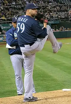 On January 19, 2012, the Seattle Mariners signed Pérez to a minor league deal with an invitation to spring training. The contract contained a $750,000 bonus for making the Mariners 25-man roster and $250,000 in performance incentives.[18] Pérez made 22 relief appearances with the Tacoma Rainiers of the Class AAA Pacific Coast League,[17] was 2–2 with a 4.65 ERA, and was promoted to the major league club on June 16 as a reliever.[19] In his first month back in the majors since 2010, observers took note of his improved fastball velocity and strikeout-to-walk ratio.[20] In 2012, Pérez went 1–3 with a 2.12 ERA with 29.2 innings in 33 games.