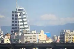 Designed by the Taiwanese architectural group Taipei International Group, under the requirements of preventing earthquakes and typhoons common in Taiwan, the design resembles that of Burj Al Arab in Dubai, United Arab Emirates, symbolizing plain sailing and prosperity.[4] The first to fifth floors and the podium are used as shopping malls, and the sixth floor is a public facility space, featuring a library, indoor swimming pool and gym for residents.[5] The seventh to twenty-seventh floors of the building house 111 apartment units with independent entrances and exits.[6] In February 2020, Don Quijote, Japan's largest discount store chain, rented the mall on the 1st to 3rd floors at a monthly rent of NT$4.62 million as its first store in Taiwan.[7][8]