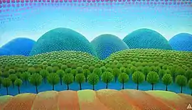 The naive style is typical of Ivan Rabuzin; lyrical and idealized landscapes based on a sequence of circles or round shapes, filled with optimism and spirituality. His style is recognized worldwide as unique and great contribution to the development of naïve art. It is characterized by modernism of visual expression, as it reduces the use of geometric shapes, causing his art to be among the legacy of contemporary art.[1] His works are easily recognizable thanks to the combination of stylization and geometric abstraction. The colors in his paintings highlight the location and size of the images, highlighting their symbolic significance and importance.[2]