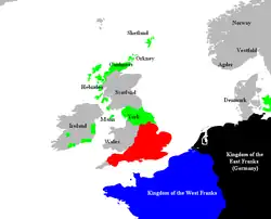 Northwest Europe at the beginning of the novel. Territories held by Shef and Alfred are denoted in red; territories held by the Ragnarssons and their allies in green.
