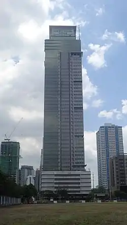 The One San Miguel Avenue is an office skyscraper located at San Miguel Avenue (hence the building's name) in Ortigas Center, Pasig, Philippines. It was completed in 2001 and stands at 183 metres (600.39 feet) from ground up to the architectural top, although if measured with its antennas, it stands at 203 metres (666 feet). It has 54 floors aboveground and 7 basement levels.