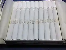 The formal Onshino Tabako system was started in 1933. During the war years, it was included in the supplies of the army and navy, each order prepared by hand. The special cigarettes were even mentioned in a war song called "Sorano Yūshi" (Brave Men of the Skies) in 1939 which portrayed the Battles of Khalkhin Gol. On the packaging of Onshino Tabako was printed a character: 賜, meaning "gift from a noble man,"[6] and the chrysanthemum crest was on every cigarette. The taste of Onshino Tabako was reportedly the same as other cigarettes. According to some men who had tasted it, it was bitter, as opposed to sweet.[7] It was not sold on the market, and was exclusively given to decorated persons, attendants at Imperial parties, visitors to and volunteers of Imperial House of Japan, and security men of the Imperial Household. The production of special tobacco for the relatives of Emperor Shōwa was discontinued by the order of the General Headquarters of Japan of the allied forces in 1945. However, Onshino Tobako as gifts continued to be produced.