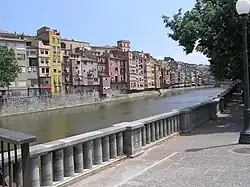 During its course through the city, the Onyar river is joined by the waters coming from the Monar or Conda irrigation channel (which in turn comes from the Ter river), a channel that used to irrigate the orchards in the "Mercadal" area.[1] As it journeys further north, the river converges with the Güell and the Galligans rivers near the crossing with the railway. Finally, it merges into the Ter river near the Pedret neighborhood.