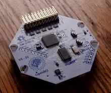 The OpenBCI 32-bit board uses the ADS1299, an IC developed by Texas Instruments for biopotential measurements.[2] The OpenBCI uses a microcontroller for on-board processing — the 8bit version (now deprecated) uses an Arduino-compatible ATmega328P IC, while the 32bit board uses a PIC microcontroller — and can write the EEG data to an SD card, or transmit it to software on a computer over a bluetooth link.