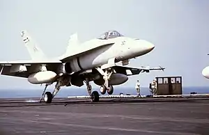 ![]() A VMFA-314 F/A-18A lands on USS Coral Sea | |||||||