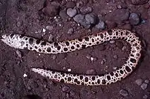 The Pacific snake eel (Ophichthus triserialis, also known as the spotted snake eel in the United States[2]) is an eel in the family Ophichthidae (worm/snake eels).[3] It was described by Johann Jakob Kaup in 1856, originally under the genus Muraenopsis.[4] It is a marine, subtropical eel which is known from the eastern central and southeastern Pacific Ocean, including California, USA, Peru, the Gulf of California, Mexico, the Galapagos Islands, Colombia, Ecuador, Costa Rica, El Salvador, Honduras, Guatemala, Nicaragua, and Panama.[3][5] It dwells at a maximum depth of 155 metres (509 ft), and forms burrows in mud and sand sediments. Males can reach a maximum total length of 115 centimetres (45 in), but more commonly reach a TL of 80 centimetres (31 in).[3]