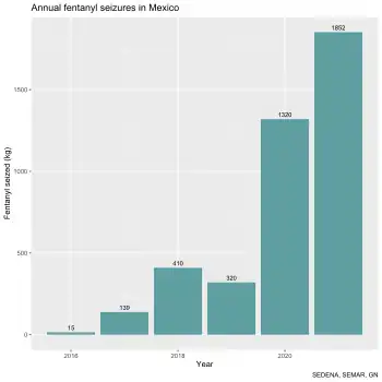 According to the United States Drug Enforcement Agency in 2023, China continued to be the primary source of fentanyl being imported into the United States, killing over 100 Americans every day.[124] Over a two-year period, close to $800 million worth of fentanyl pills were illegally sold online to the US by Chinese distributors.[125][126] The drug is usually manufactured in China, then shipped to Mexico, where it is processed and packaged, which is then smuggled into the US by drug cartels.[127] A large amount is also purchased online and shipped through the US Postal Service.[128] It can also be purchased directly from China, which has become a major manufacturer of various synthetic drugs illegal in the US.[129] AP reporters found multiple sellers in China willing to ship carfentanyl, an elephant tranquilizer that is so potent it has been considered a chemical weapon. The sellers also offered advice on how to evade screening by US authorities.[130] According to Assistant US Attorney, Matt Cronin: