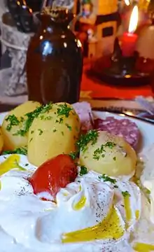 At Christmas, which is especially richly celebrated in the Ore Mountains, many households still make Neinerlaa. The ingredients vary from region to region, sometimes even from village to village. In any case, on Christmas Eve nine elements are served, for example, bratwurst, sauerkraut and lentils, each element supposedly having a special significance for the coming year. For example, dumplings stand for wealth and celery for fertility