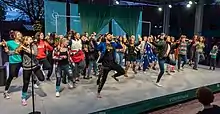 In still another innovation by Bill Rauch, the Green Show was revamped in 2008. The shows now vary widely with performers such as a dance group from Mexico or India one night, clowns doing ballet on stilts the next, and a classical music quartet on another. A fire show, juggler, or magician might be seen along with improv, metal, or rock-n-roll variations on Shakespeare. Individual performers, groups, choirs, bands, and orchestras may present Afro-Cuban, baroque, blues, classical, contemporary, cowboy, funk, gospel, hip-hop, jazz, mariachi, marimba, poetry, marionette, renaissance, or salsa, sometimes combined in unexpected ways.[1][15][16]
