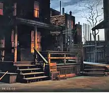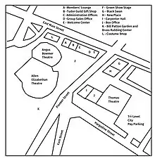 The next year saw the opening of the current outdoor theatre, whose name was changed from Elizabethan to Allen Elizabethan Theatre in October 2013.[25] Patterned on London's 1599 Fortune Theatre and designed by Richard L. Hay, it incorporated all the stage dimensions mentioned in the Fortune contract. The trapezoidal stage was retained but the façade was extended to three stories, resulting in a forestage, middle stage, inner below, inner above (the old balcony), and a musicians' gallery. The wings were provided with second-story windows. Each provides acting areas, creating many staging possibilities. A pitched, shingled roof enhances the half-timbered façade. A windowed gable was extended from the center of the roof to cover and define the middle stage. Just before each performance, an actor opens the gable window, and in keeping with Elizabethan tradition signaling a play in progress, runs a flag up the pole to the sound of a trumpet and doffs his cap to the audience.