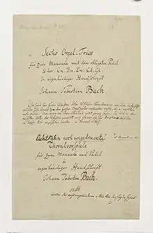 The organ sonatas were first gathered together in Leipzig in an autograph manuscript which Bach scholars have dated to a period roughly between 1727 and 1730. Apart from the heading with the numbering of the six sonatas and an indication of where the manuscript ends, Bach himself left no further specifications. After Bach's death, the musician Georg Poelchau (1773–1836) produced a covering page for the collection (along with the Great Eighteen Chorale Preludes) with a title and commentary.[2]