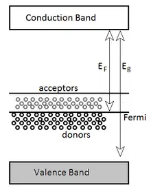 where NC and NV are the densities of states at the bottom of the conduction band and the top of the valence band, respectively, EC and EV are the corresponding energies, EF is the Fermi level, kB is Boltzmann's constant and T is the absolute temperature. Addition of impurities into the semiconductor, or doping, produces excess holes or electrons, which, with sufficient density, may pin the Fermi level to the impurities' position.[6]
