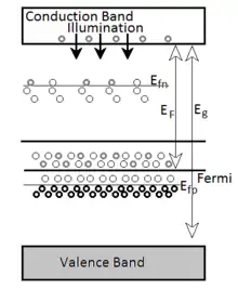 A sufficiently energetic light can excite charge carriers so much that they will populate the initially empty localized levels. Then, the density of free carriers in the conduction and/or the valence band will increase. To account for these changes, steady-state Fermi levels are defined for electrons to be EFn and, for holes – EFp. The densities n and h are, then equal to
