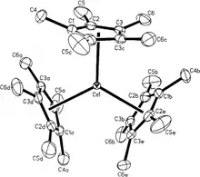 Organocerium chemistry is the science exploring the properties, structure, and reactivity of organocerium compounds, chemical compounds that contain one or more chemical bond between carbon and cerium. These compounds comprise a subset of the organolanthanides. In general, organocerium compounds are not isolable, and are rather studied in solution via their reactions with other species. There are notable exceptions, such as the Cp*3Ce(III) complex shown at right, but they are relatively rare. Complexes involving cerium of various oxidation states are known: though lanthanides are most stable in the +3 state,[2] complexes of cerium(IV) have been reported. These latter compounds have found less widespread use due to their oxidizing nature, and the majority of literature regarding organometallic cerium complexes involves the +3 oxidation state. In particular, organocerium compounds have been developed extensively as non-basic carbon nucleophiles in organic synthesis. Because cerium is relatively non-toxic, they serve as an "environmentally friendly" alternative to other organometallic reagents. Several reviews detailing these applications have been published.[3][4][5]