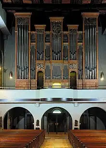 Pipe organ manufacturing in Hardheim has existed since 1855, when organ-builder Ignaz Dörr started his own workshop. In 1958 Orgelbaumeister Hans Theodor Vleugels (born 1931) took over Maximilian Bader's workshop and two years later his brother's Wilhelm Bader. From 1960 to 1966 Paul Mund and Hans Theodor Vleugels led the company together. In 1967 Hans Theodor Vleugels founded the Orgelbau-Vleugels GmbH. While following traditional south German models, the company initially built instruments incorporationg modern technologies such as electric stop action. Cases had very contemporary designs, such as the organ in Cologne-Gremberg, set on a mushroom-shaped concrete pedestal, or in another organ that has free hanging steel frame with plexiglass used for the swell box and rollerboards, thus enabling a free view into the workings of the instrument. During the 1970s the firm abandoned the use of tropical woods and laminates in favour of solid woods, and electric action likewise was discarded in favor of mechanical action. While continuing to build new organs in the 1980s the firm began to devote attention to the restoration of older instruments, including organs of the South German Baroque, and Romantic instruments with valve chests and pneumatic actions. in 1988 the company moved into a large, open, and modern shop; that same year, Hans-Georg Vleugels (born in Stuttgart in 1958) became director of the firm.[1] In 1991 Hans-Georg Vleugels took over the company chair and currently runs the company together with his son Johannes D.C. Vleugels (born 1983) in the second and third generation. Today there are three generations of master pipe organ builders in the Vleugels family working together.