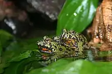 The Oriental fire-bellied toad (Bombina orientalis) is a small semiaquatic frog species found in northeastern Asia, where they primarily dwell in slow-moving bodies of water and temperate forests. Quite common throughout much of their range, these frogs have mild toxins that can be excreted through their skin, with their vibrant underbellies serving as a warning of this. While not a true toad, their green and black skin is covered in small tubercles, giving them a toadlike appearance. Their sounds, mainly produced by males during the mating season, are very unlike those of other frogs. While their population is in decline, their numbers are still high overall, with the International Union for Conservation of Nature (IUCN) rating them as a least-concern species. They are commonly kept as pets in land and water vivaria, as a relatively easy-to-care for species. They are also frequently used in scientific research, with their behavior, vocalizations, and learning skills all moderately studied.