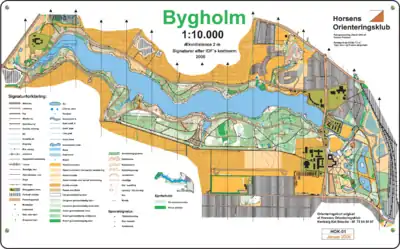 The map scale depends on the purpose of the competition and also the standard used, for example, a map used in a foot orienteering long distance event has a scale of 1:15000. The map is printed in six base colours,[3] which cover the main groups: Land forms, rock and boulders, water and marsh, vegetation, and man-made features, and an extra colour for overprinting symbols.