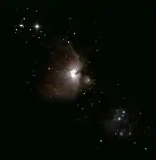 42 Orionis, also called c Ori, is a B1V magnitude star in the northern half of the Orion nebula.[3] Theta Orionis has a more central position in the nebula, and is actually composed of a multi-star system.[4] Iota Orionis is one of the brightest in the collection, in the south of the Orion nebula. Iota Orionis is a spectroscopic binary system, with a variable magnitude of O9III.[5]