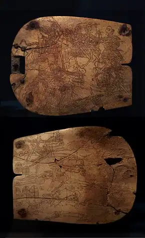 The Orlat plaques are a series of bone plaques that were discovered in the mid-1980s in Uzbekistan. They were found during excavations led by Galina Pugachenkova at the cemetery of Orlat, by the bank of the Saganak River (a tributary of the Zeravshan), immediately north of Samarkand.[1][2] Pugachenkova published her finds in 1989. The left half is decorated with an elaborated battle scene, while on the other side is depicted a hunting scene.