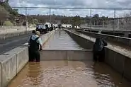 Erosion at the base of the weir—which was expected—progressed much faster than anticipated.[17] The headward erosion of the emergency spillway threatened to undermine and collapse the concrete weir, in which case a 30-foot (9 m) wall of water would be sent into the Feather River below and flood communities downstream.[12] Fearing a collapse, the Butte County Sheriff's Office issued an evacuation order of the Oroville area.[12][17] To ease pressure on the emergency spillway and prevent a possible collapse of the weir, the DWR nearly doubled the discharge volume of the main spillway from 55,000 cu ft/s (1,600 m3/s) to 100,000 cu ft/s (2,800 m3/s).[17] Several hours later, water stopped flowing over the weir onto the emergency spillway and officials began assessing the state of the emergency spillway.[17]
