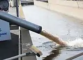 About 150,000 cubic yards (110,000 m3)[33] of erosion debris clogged the channel of the Feather River below the dam, preventing release of water from the hydroelectric plant, thus reducing the overall capacity of the dam to release water.[20] Debris was carried downstream and caused damage to the Feather River Fish Hatchery due to high turbidity.[34] State workers began evacuating fish and eggs from the hatchery in an attempt to mitigate the damage and evacuated over nine million fish downstream to a satellite hatchery adjacent to Thermalito Afterbay.[35][36]