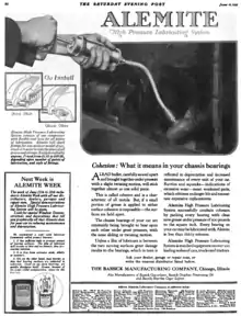 The patent for the Zerk fitting was granted to Oscar U. Zerk in January 1929, and the assignee was the Alemite Manufacturing Corporation.[1] Alemite had already been marketing, since 1919,[2] ball check valves to accept grease supplied under pressure from a grease gun, such as for car and truck chassis lubrication points, both for OEM installations and for aftermarket upgrade kits which would screw in as replacements for stock grease cups, but Zerk's fitting was an improved style, less vulnerable to dirt and more forgiving of angled approach. Today, many companies make these grease fittings.