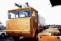 The dry chemical system consisted of a hose reel (manufactured by Hannay), a large Purple-K (PKP) canister, and a nitrogen tank.[3] The hose reel was 100 feet long, with a 3/4 inch diameter hose. The end of the hose consisted of a single attachment, which could be opened and closed using a lever/handle mounted to the top. The firefighter operating it would pull back on the handle to release the dry chemical. The dry chemical hose, much like the front handline, had an electric rewind system activated with a button mounted above the reel. The PKP canister was a large, upright tank with two hoses attached to a valve on top of the canister. One hose carried an inflow of pressurized nitrogen, and the other was an output to the 100-foot hose reel.[3] The canister would have been filled with 150 pounds of PKP, loaded through the top. A nitrogen canister charged to 2500 psi would feed this tank through a 60 psi regulator. The compressed air would exit the PKP tank with the powder, and leave the end of the hose in a large white cloud.[3] An alternative to using the dry chemical hose was to grab one of the many handheld fire extinguishers. The MB-5 had multiple mounts for Purple-K extinguishers, with 5 on the top deck, and 3 in a curbside compartment. These could be used to apply dry chemical where the hose didn't reach.[3]