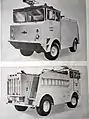 The roof-mounted turret was designed by Cardox Ltd and fed by a 14 pounds per square inch (97 kPa) rotary vein pump (also built by Cardox Ltd).[3] It was manned by one firefighter, who would stand in a roof hatch. This hatch was positioned to the rear of the cab and would latch shut. To open the hatch the operator would simply pull back on the latch holding it in place, and then push up. The turret was of multi-piece construction, with a water deflecting component attached to the end of the nozzle. This, combined with the adjusting handle, allowed the turret to have an infinitely variable spray pattern. Below the turret was a 90° pipe angle, connected to a 4+1⁄2 inches (110 mm) diameter hose visible in the cab. This hose was connected directly to the output of the turret pump. The turret had a wide range of motion, capable of pitching 25° while aiming down, and 60° aiming up. It could also yaw 360° in both directions, but this range was limited by the operator's reach.[3] To the right of the turret was a selection lever, which would allow the turret to output foam or water depending on the turret operator's selection.