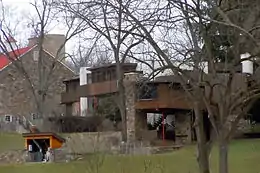 Built in 1938, from the stone walls of an existing stone and frame farmhouse, this historic structure is "L"-shaped, as was the farmhouse, with frame walls sheathed in cypress. Designed by its owner, architect Oskar Stonorov, it features large window openings, and a flat roof with parapet or thin edge overhang. A guest house was added to the property during the early 1950s.[2]