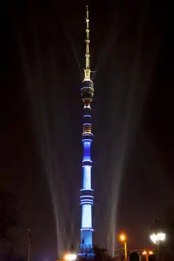Ostankino Tower (Russian: Оста́нкинская телеба́шня, romanized: Ostankinskaya telebashnya) is a television and radio tower in Moscow, Russia, owned by the Moscow branch of unitary enterprise Russian TV and Radio Broadcasting Network. Standing 540.1 metres (1,772 ft), it was designed by Nikolai Nikitin. As of 2022, it is the tallest free-standing structure in Europe and 12th tallest in the world. Between 1967 and 1974, it was the tallest in the world. The tower was the first free-standing structure to exceed 500 m (1,600 ft) in height. Ostankino was built to mark the 50th anniversary of the October Revolution. It is named after the surrounding Ostankino district of Moscow.[4][5]