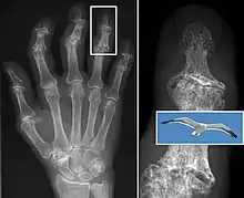 X-ray of erosive osteoarthritis of the fingers, also zooming in on two joints with the typical "gull-wing" appearance