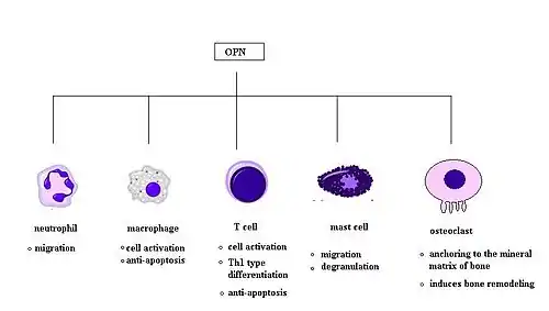 Osteopontin (OPN) is expressed in a range of immune cells, including macrophages, neutrophils, dendritic cells, microglia and T and B cells, with varying kinetics. OPN is reported to act as an immune modulator in a variety of manners.[7] Firstly, it has chemotactic properties, which promote cell recruitment to inflammatory sites. It also functions as an adhesion protein, involved in cell attachment and wound healing. In addition, OPN mediates cell activation and cytokine production, as well as promoting cell survival by regulating apoptosis.[7] The following examples are found.[7]
