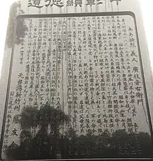 Subsequently, Hiroeda served as head of the Zhunan local government. As the Pacific War escalated, Hiroeda was ordered to assume command of a naval patrol squadron, which consisted of 2000 Taiwanese soldiers.[4] In 1943, Hiroeda and his squadron boarded a refitted merchant ship (the Busho Maru) at Takao, and were transported to Cavite on Luzon island in the Philippines[5] In February 1945, the United States Army reached the outskirts of Manila. The encircled Japanese forces were slowly forced to retreat, and Hiroeda was ordered to supply the Taiwanese soldiers under his command with sticks attached to warheads, for use in suicide charges against enemy tanks. However, Hiroeda refused to carry out his orders, and together with his Taiwanese sergeant, Liu Wei-tian (Chinese: 劉維添; pinyin: Liú Wéitiān; 1922–2013), entered secret negotiations with the US forces. In the afternoon of February 23, Hiroeda ordered the soldiers under his command to surrender to the US forces, saying, "You are Taiwanese and no doubt have wives, parents, and siblings waiting for you at home. It is unfortunate we cannot return together, but you men at least should return home alive. I am Japanese, and therefore I alone am responsible for this".[6] Hiroeda then committed suicide by shooting himself. He was 40-years-old.[7]