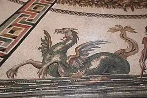 The massive baths buildings include a great "octagonal room’" in which the spectacular mosaic pavement was found, now in the Sala della Rotonda, Museo Pio-Clementino. Of the many other superb works of art found (many in the Vatican museum) are the celebrated head of Zeus of Otricoli and the head of Claudius both also shown in the Sala della Rotonda. Winter baths to the north also existed as evidenced by inscriptions, referring to their restoration in the 4th century, and statue bases.[11]