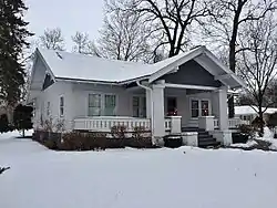 It is a side-gabled Craftsman-style bungalow with wide eaves and a large front porch. The porch is unusual for this style in having curved ends of its terrace. The interior is intact and is "notable for its fine built-ins and for the high quality of the materials used."[2]