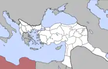 Ottoman Tripolitania, also known as the Regency of Tripoli, was officially ruled by the Ottoman Empire from 1551 to 1912.[1][2] It corresponded roughly to the northern parts of modern-day Libya in historic Tripolitania and Cyrenaica.[1][3] It was initially established as an Ottoman province ruled by a pasha (governor) in Tripoli who was appointed from Constantinople, though in practice it was semi-autonomous due to the power of the local Janissaries.[1][2] From 1711 to 1835, the Karamanli dynasty ruled the province as a de facto hereditary monarchy while remaining under nominal Ottoman suzerainty.[1] In 1835, the Ottomans reestablished direct control over the region until its annexation by Italy in 1912.[4]