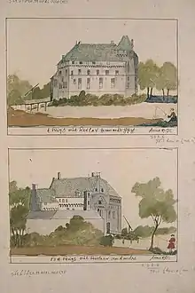 The first written reference to the Oud Herlaer Castle dates from when it was sold in 1315.[4] The first depiction of the castle dates from a painting made by Pauwels van Hillegaert in 1631, depicting the 1629 siege of 's-Hertogenbosch. It shows the castle from such a distance that it's not useful.[7] The eighteenth century pictures are better, but not conclusive. They often show a round stone ring wall with a roof. A 1735 floor plan by Hendrick van der Beck, and an etching by Hendrik Spilman show this as a more polygonal structure.