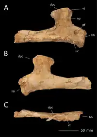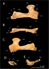 | Abelisauridae[25] | Indeterminate | Sidi Chennane | Maastrichtian | right tibia | Probably distinct from Chenanisaurus due to its smaller size (about 5 m (16 ft) long) despite being mature. Similar to South American abelisaurids. | |