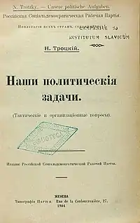 Our Political Tasks (Russian: Наши политические задачи) is a pamphlet by Leon Trotsky, published in 1904 as a response to the book of Vladimir Lenin "One Step Forward, Two Steps Back". It is the first relatively large work of the author; the book was aimed against the RSDLP party split, in which Lenin was accused.
